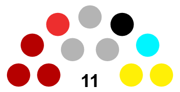 | current | 02:21, 30 December 2025 | 360 × 185 (13 KB) | MrNeighbor (talk | contribs) | {{legend|#B60000|WPR: 3 seats}} {{legend|#ED2E2E|TP: 1 seat}} {{legend|#B4B4B4|IND: 3 seats}} {{legend|#000000|GER: 1 seat}} {{legend|#00F5FF|RBP: 1 seat}} {{legend|#FFF006|piss party : 2 seats}}e |