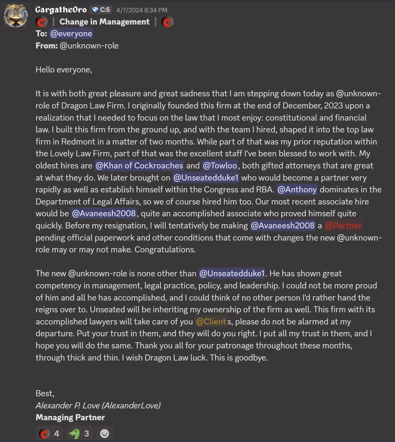 Dragon Law Firm - April 7th 2024, AlexanderLove resigns from his position as Managing Partner