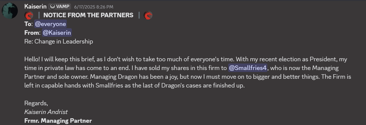 Dragon Law Firm - Kaiserin leaves Dragon Law due to becoming the President. Appoints Smallfries4 as successor.