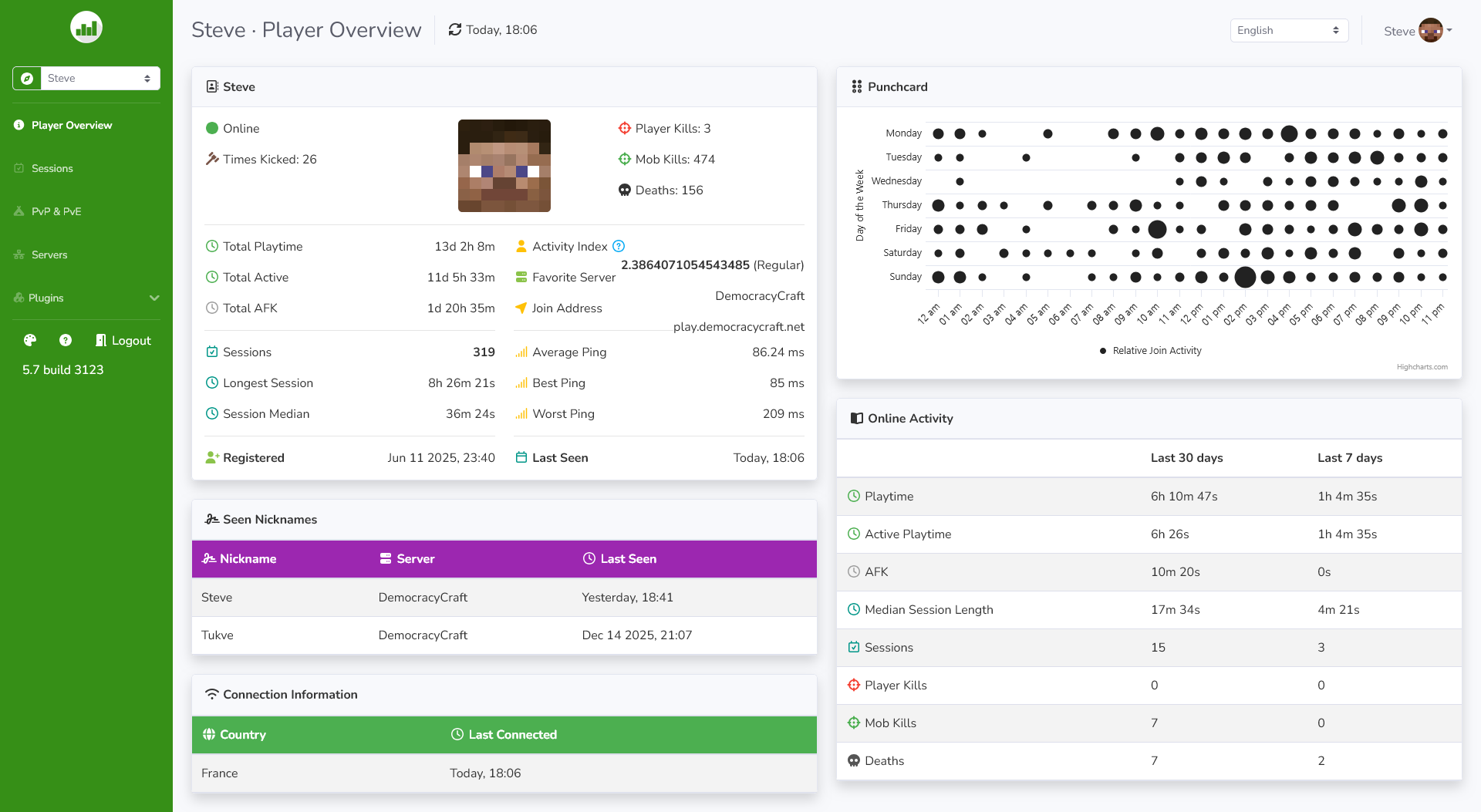 Screenshot of analytics.democracycraft.net page, with informations anonymized as Steve.