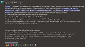 The subpoena was issued on the 1st of october 2025 marking the start of the end for the Pluragate scandal. Plura complied with the subpoena but allegedly invoked the 5th to most questions asked internally in a LEG-RESTRICTED channel where the information was posted, After that the hearing did continue until representative Scassany on october 10th Issued a motion to declassify all contents within the channel where plura had been issued the subpoena.