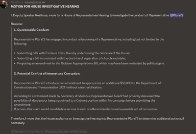 Following Plura72's motion, Deputy Speaker RealImza initiated a Investigative Hearing to learn plura's motives.