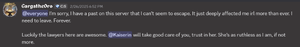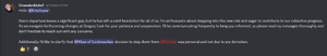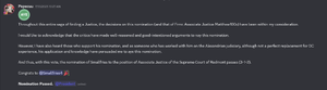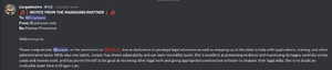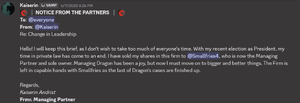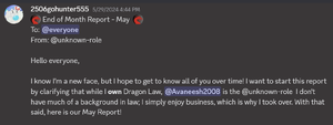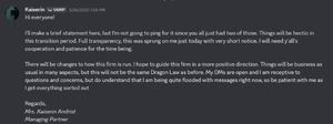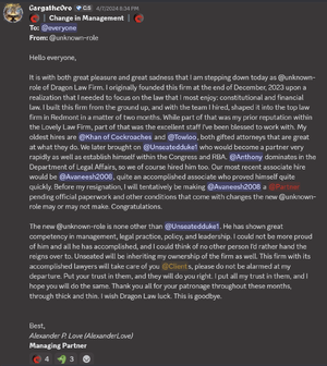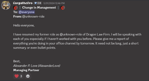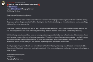 On April 12th, 2025, Kaiserin_ posted a message sharing that Dragon Law Firm would no longer be hiring additional employees[10], which was not changed until the firms closure. Several months later on June 17th, Kaiserin_ announced that she would be backing away from the position due to her election as President, selling her remaining shares in the company to Smallfries4[11], who would administer the remainder of the cases until his appointment as a Supreme Court Justice[12][13].