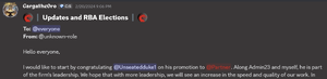 On April 7th, 2025, AlexanderLove announced that he would be stepping down as Managing Partner, designating UnseatedDuke1 as his successor[3]. Around March 29th, ownership was given to 2506gohunter555 [DISCORD USERNAME, REQUIRES ADDITIONAL RESEARCH] while the Managing Partner became Avaneesh2008[4]. Shortly thereafter, on March 31st, 2025, AlexanderLove returned and resumed his position as Managing Partner[5].