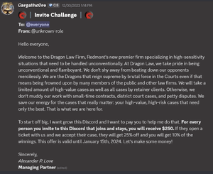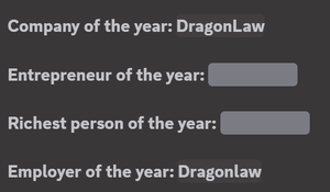 Dragon Law Firm was a Redmontian law firm based in Reveille. It was founded by AlexanderLove on the 30th of December, 2024[1]. It won Employer of the Year and Company of the Year at the 2025 Players' Choice Awards[2]. It was the largest law firm and employer for several months at the beginning of 2025.
