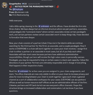 Partners were chiefly responsible for a chain (informally structured before January 4th, 2025), often consisting of a group of Associates and Paralegals.[15] The following individuals (excluding future Managing Partners) were Partners at some point in the firms history: