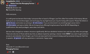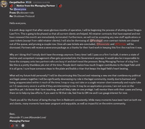 On June 20th, 2025, Managing Partner AlexanderLove announced that Dragon Law would be shutting down[6]. It was reopened December 14th of that year[7].