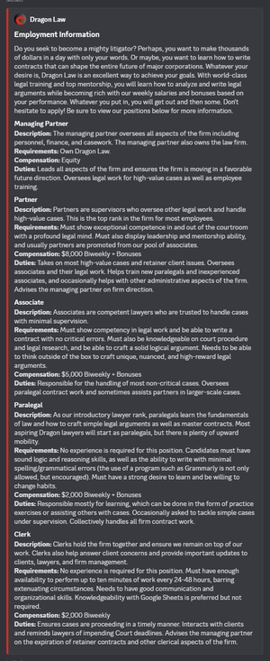 Dragon Law Firm consisted of, in order of seniority, a Managing Partner, Partners, Associates, and Paralegals. Additionally, the firm employed Clerks. [14]