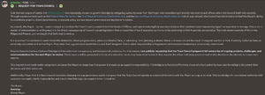 During his term, mayor Yeet Boy was criticized for being inactive, and on December 23, Juniperfig announced that a private vote had been held, and the new Oakridge town council had chosen to remove mayor Yeet Boy. Deputy mayor Modzy_ was at the same time removed via a Department of State decree. Head of Urban Development Talion77 confirmed the reason for the removal of the mayor and deputy mayor were due to the newly elected town council not receiving their roles in the Oakridge discord server.[10]